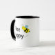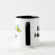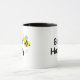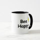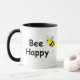 La taza de café feliz de la abeja tiene una abeja amarilla linda el zumbar alrededor.