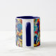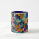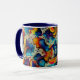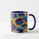 Esta es una colorida abstracción multicolor azul, violeta, roja, amarilla, naranja, negra y cian en tinta líquida sobre un fondo beige claro.