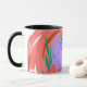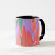 This striking mug design showcases an abstract pattern of vibrant colors and fluid shapes, representing figures of organic forms. The blend of warm coral and cool purples creates a captivating visual experience, symbolizing traction in creative expression while navigating through routes of artistic exploration. This design exudes a sense of movement and congestion, inviting the viewer to immerse themselves in its dynamic beauty.