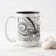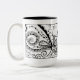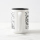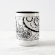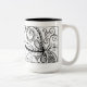 Esta taza caprichoso diseñada se adorna con floral inspirada dibujada mano usando la tinta negra en un fondo blanco.
