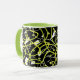 Abstracción del tazón de café con formas geométricas y líneas caóticas color negro y verde sobre fondo blanco
