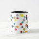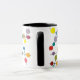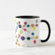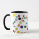 Esta taza tiene un diseño moderno de mediados de siglo de líneas negras con círculos de diferentes colores y tamaños en un campo de blanco.