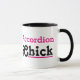 Esta taza blanca con un elegante mango negro e interior presenta la frase "Chick de acordeón" en un divertido y audaz tipo de letra con acentos magenta. Está diseñado para mujeres amantes del acordeón que deseen empezar el día con buen pie o disfrutar de una bebida. La taza es un gran regalo para los músicos, profesores de música o cualquier persona que ame el sonido único del acordeón.