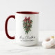 Moderna y elegante caligrafía Ink Script Watercolor Pines Winter Greeneration con Ornamentos de Navidad Borgoña Cinta Roja Bow, Cones de Pino y Holly Berries Feliz Navidad Gran Café Mug