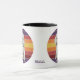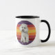 Un retrato de un adorable perro fideo en miniatura blanco es la característica de esta taza. La imagen se coloca sobre un fondo retro, un poco perturbado de puesta de sol a rayas, y se imprime dos veces en la taza. Su nombre está en la combinación de guiones púrpura entre las imágenes.