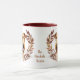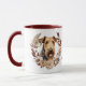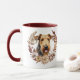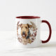 Una corona de otoño de bonito en tonos marrones, canela y crema rodea la imagen acuarela de un Perro Airedale Terrier. La imagen se imprime dos veces en la taza, con el texto de su personalizado entre ellas.