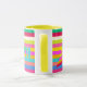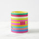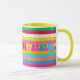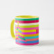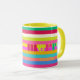 Celebre las vacaciones con un estilo moderno y luminoso con esta alegre banda de arcoiris, una taza de vacaciones personalizada, un regalo personalizado colorido que seguramente encantará a la familia, amigos y compañeros de trabajo que aprecian el color con su café o té. El fondo luminoso a rayas con una estrella en el árbol de Navidad con rayas geométricas. El texto alegre y un nombre personalizado o mensaje personalizado completan las vibraciones festivas. Rosa caliente, fucsia, salmón, naranja, amarillo, azul, rojo y verde.