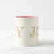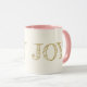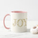 Esta taza tiene una palabra mate de color dorado "JOY" sobre fondo blanco. Se muestra con interior y mango rosa que puede seleccionar su color. Personalizar esta taza o compra como se muestra.