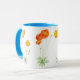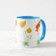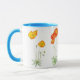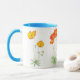 Una taza blanca bonita del campanero con una manija de los azules claros y borde, adornado con las amapolas de Islandia anaranjadas y amarillas, de una pintura de la acuarela por Judy Adamson.