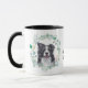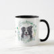 "LOVE MY BORDER COLLIE" declara esta taza para el amante de los perros del Collie Fronterizo. Cada lado de la taza tiene un hermoso retrato acuarela de un color blanco y negro en una corona azul de hojas verdes. Entre las dos imágenes está el texto, que puede ser fácilmente personalizado, o incluso eliminado, por usted.
