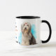 Un retrato de un adorable Perro Collie con barba es la característica en dos lados de esta taza. Cada imagen se coloca sobre un fondo de salpicadura azul brillante. Entre las dos imágenes está el texto que describe a este amable y leal compañero, con "el perro COLLIE BARDED" en negro en la parte inferior. Todo el texto se personaliza fácilmente para que puedas describir a tu propio amigo leal.