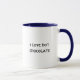la taza blanca y azul me pone letras "ama el chocolate caliente" en negro. simple y divertido.