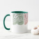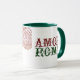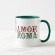 el detalle precioso del cordón real del vintage verde con el texto de las palabras "amor Roma" dos amor de las palabras que se reflejan, del "amor" y de "Roma" está en rojo oscuro, y Roma es en colores verde oscuro, en un estilo adornado y decorativo del texto o de fuente, y sobre ella es una sección del cordón verde floral decorativo con las flores y las hojas, una tela antigua