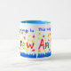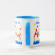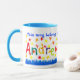 Una gran taza de ringer blanca con una llanta y mango azul en polvo y las palabras "Esta taza pertenece a" con letras azules a juego, seguida de "Andrew" en el collage de papel pintado a mano, con una salpicadura de estrellas rojas, naranjas y amarillas, sobre un fondo blanco. Caja fuerte con microondas y lavavajillas.