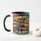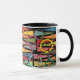 Esta taza tiene un diseño moderno de mediados de siglo de triángulos y anillos de colores retro en un campo de negro.