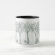 Una taza de café en invierno con un bolígrafo negro y un dibujo de tinta de un bosque con animales de bosque incluyendo conejos y un ciervo en la nieve.