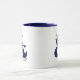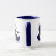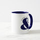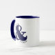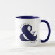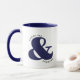 Taza de Café de Pareja Personalizable Azul Marino y Blanco con fuente moderna, perfecta como regalo de aniversario.