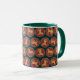 Un tazón de café verde oscuro y blanco de moda, con un patrón de marrón y caballos de efecto oro sobre un fondo verde oscuro que se puede cambiar fácilmente si se desea. El motivo del caballo es de un ilustracion pintado a mano por Judy Adamson.