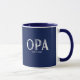 Opa un diseño de tazón de café con un año determinado con una fuente sellada en blanco sobre un fondo azul marina. Haga clic en personalizar para editar el color de fondo!. Visita nuestra tienda para ver esta taza en una gran variedad de nombres de abuelo.
