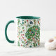 Taza de café en una toma de Nouveau del arte de William Morris en "árbol un modelo tradicional de la vida", ofreciendo los árboles de la fantasía rodeados por las ramas llenadas de las flores y de los pájaros exóticos, sombras del verde esmeralda, moreno, oro, rojo, y azules turquesas, en un fondo blanco