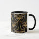 Esta taza tiene un diseño Art Déco de diamantes y triángulos en oro sobre un campo de negro.