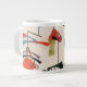 Cada día puede ser una ráfaga a partir del pasado con esta taza enorme inspirada moderna de los mediados de siglo. Las características del diseño una reproducción de un modelo móvil atómico de la tela del vintage. El fondo es ecru con formas azules, anaranjadas, verdes y negras del arte moderno.