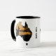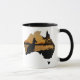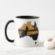 Una hermosa taza de café negra con una magnífica imagen de puesta de sol que muestra (el contorno) un canguro, un árbol y las mundialmente famosas Montañas Glass House en Queensland, Australia. La espectacular puesta de sol dorada le da a la imagen un gran color. Para hacer esta taza aún más especial, la foto está en la forma del país Abajo. Disfruta aún más de tu bebida favorita con esta taza única. El comienzo perfecto de tu día. ¡Ideal para pasar tu jornada laboral! ¡Y no te olvides de regalarlo a tus amigos y familia!