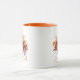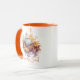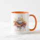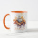 Fantasma lindo con una taza de café en un montón de hojas caídas