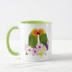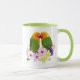Dos pájaros de amor juntos en una rama de árbol con flores rosas, amarillas, blancas y violetas a su alrededor.