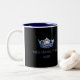 Una impresión azul de la corona que destellaba contrapesó el frente y el centro en cada lado de esta taza del café/del cacao. Mostrado en una taza negra y blanca con un texto azul interior y de coordinación de la marina de guerra. Modifique su interior para requisitos particulares y personalice el texto de la muestra sus el propio. Mostrado como Srta. Hamilton 2018.