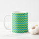 Una taza de café de moda con un patrón de Chevron en verde neón y azul deslumbrante. Parte de la colección "Blue Moons" de Posh & Painterly.