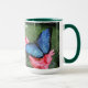 Mug decorativa en tonos azules, rosas y verdes. Bellas mariposas azul morfo sobre el fondo de rosas florecientes cerca del agua.