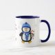 Esta taza de vacaciones tiene un lindo pingüino personalizado con una bufanda de rayas azules y un gorra de invierno azul. Lleva un bastón de caramelo rojo y blanco a rayas atado con un arco verde. Unos cuantos copos de nieve se escurren a su alrededor. La imagen se repite a cada lado, con tres campos de texto para el texto del personalizado entre ellos. Perfecto para los niños grandes y pequeños durante la temporada de Navidades. Asegúrese de ver los otros Navidades pingüinos en nuestra tienda.