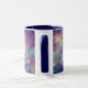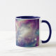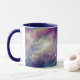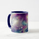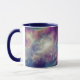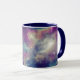 Acuarela abstracta azul-violeta y verde azulada nebulosa cósmica fantástica con inclusión blanca y resplandor dorado.