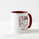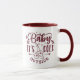 Baby hace frío afuera Maroon Holiday Navidad Taza. Este diseño invernal lindo presenta tipografía de letra moderna, copos de nieve y mitones.