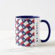 TEXAS FLAG personalizado para café Mug con TEXTO PERSONALIZABLE. Elegante taquilla personalizada de la bandera de Texas con un inusual patrón de bandera superpuesta, que crea un diseño geométrico moderno. El nombre del marcador de posición aparece en un tipo de letra azul marino en negrita y se gira 90 grados. Este texto es personalizable, por lo que puede personalizar con su nombre u otro texto. Esto sería un gran regalo para el bebedor de café patriótico, y su patrón inusual lo diferenciará de los habituales tazas de la bandera de Texas en el mercado. Ideal para cumpleaños y Navidades, y para uso privado y de negocios. Hay regalos coincidentes disponibles.