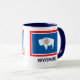 La bandera roja, blanca y azul del estado de Wyoming con el sello blanco del estado de bisonte en el medio, y el texto WYOMING en la parte inferior en azul oscuro. Ambos lados de la taza tienen la misma imagen y texto.