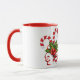 La taza de café de cerámica se muestra con una impresión festiva del arte de los bastones de caramelo del día de fiesta del navidad con Felices Navidad en texto.