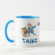 Este diseño que teclea del taiko lindo tiene un dibujo animado Akita o Shiba Inu, perro japonés, jugando un tambor del taiko. Está llevando una capa y una venda del hapi y está sosteniendo dos el bachi, palillos.