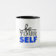 Embrace your true self with this distinctive two-tone mug. Featuring a dynamic "Be Your Self" graphic in black and bold blue, this ceramic mug is designed to inspire. The contrasting black interior and handle make the motivational message pop. A perfect vessel for your morning routine or a thoughtful, encouraging gift.