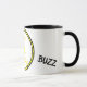 Abeja sonriente pintada a mano que zumbaba para saludar con franjas amarillas negras y alas flameantes. Buzz está escrito en texto negro en ambos lados de la taza. El fondo es blanco crujiente. El guarnecido circular del borde está delineado en negro con puntos negros contra fondo amarillo. Agradable durante la primavera o los meses de verano para alegrar la decoración de la cocina. Diversión para cualquiera que ame las abejas. Material gráfico original © TamiraZDesigns. www.zazzle.com/tamirazdesigns