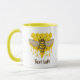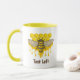 Abeja de miel con alas abiertas icono sobre colmena de abejas y gotas de miel. Texto personalizado en ambos lados.