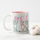 Mug de diseño de conejo divertido para alguien con un nombre de 7 letras. El nombre de ejemplo es Melanie. Conejos pequeños. Rosa divertida y Mug blanca con ilustracion de Conejos en rosa y azul. Los conejos están sosteniendo tarjetas para deletrear el nombre.