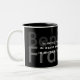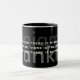 Famosa cita de B. Franklin: "En el vino hay sabiduría, en la cerveza hay libertad, en el agua hay bacterias." diseño en una taza de dos tonos con fondo negro.