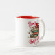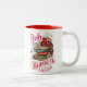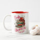 A fun and cheerful Christmas holiday design showcases a stack of books topped with a pair of glasses, a red and green scarf, and a cup of hot cocoa with whipped cream. Surrounding the books are holly leaves, candles, and stars. The colorful text reads: "Books, blankets, and hot cocoa." This design is available on a variety of products, making it a perfect gift for book lovers.