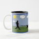 Esta es una silueta negra de sombra de un perro tirando al arnés de una persona. El diseño es sencillo y alegre, con el perro sobre hierba verde, las nubes blancas hinchadas, el cielo de fondo azul texturado, el sol amarillo y las siluetas de aves volando sobre la cabeza.