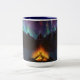 En un valle cubierto de nieve, en una noche helada en los muertos del invierno, una hoguera salta a reflejar las luces del norte que llenan el cielo sobre las montañas distantes.
