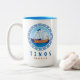 Taza de café de dos tonos de Tinos, Grecia con un diseño de un barco griego antiguo y letras de estilo griego. Este diseño de barco de la antigua Grecia tiene la llave griega en un diseño de círculo con el mar y el cielo. Este diseño de estilo griego hace que esta taza sea un regalo ideal o un recuerdo o para beber café mientras está de vacaciones en la isla de Tinos.