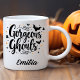 Elegante tazón de nombres personalizados de Halloween para amigos. El diseño presenta el texto "Gorgeous Ghouls" en tipografía negra con murciélagos naranjas y negros, estrellas y elementos cardíacos. Tiene un diseño con temática de juegos de palabras donde "Chicas espléndidos" ha sido diseñado como "Gorgeous Ghouls" para un toque de Halloween. Hace el mejor regalo personalizado de Halloween para tu mejor amigo. Obtén una taza para cada amigo porque los amigos que coinciden con las cosas se quedan juntos. Perfecto para que se sientan especiales, aumentar su confianza y conseguir un regalo único y agradable. Incluso tenemos sudaderas, cadenas y camisetas con el mismo diseño en nuestra colección. Por favor, compruébelo. ¡Feliz Halloween!