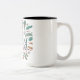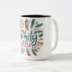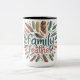 El diseño de la taza de té muestra el texto "Family Feathers", en un colorido tipo de letra de guión. Las letras están decoradas con motivos de plumas intrincados, lo que añade un toque de brillo al diseño.